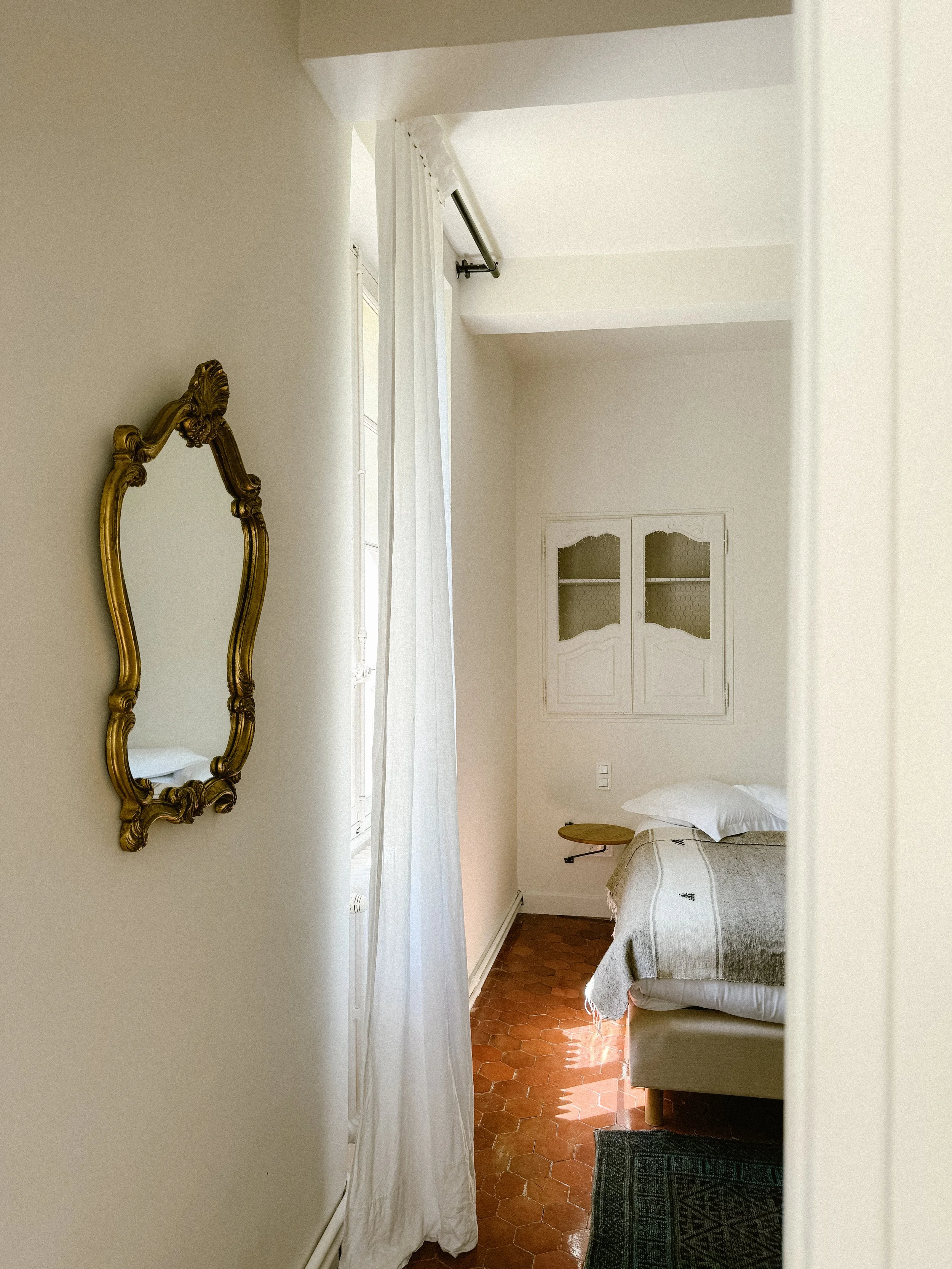 A cozy room with a double bed and an en suite bathroom with a view towards the mountains and across the front garden. In April and early May the wisteria grows outside these windows. Towels and breakfast are included